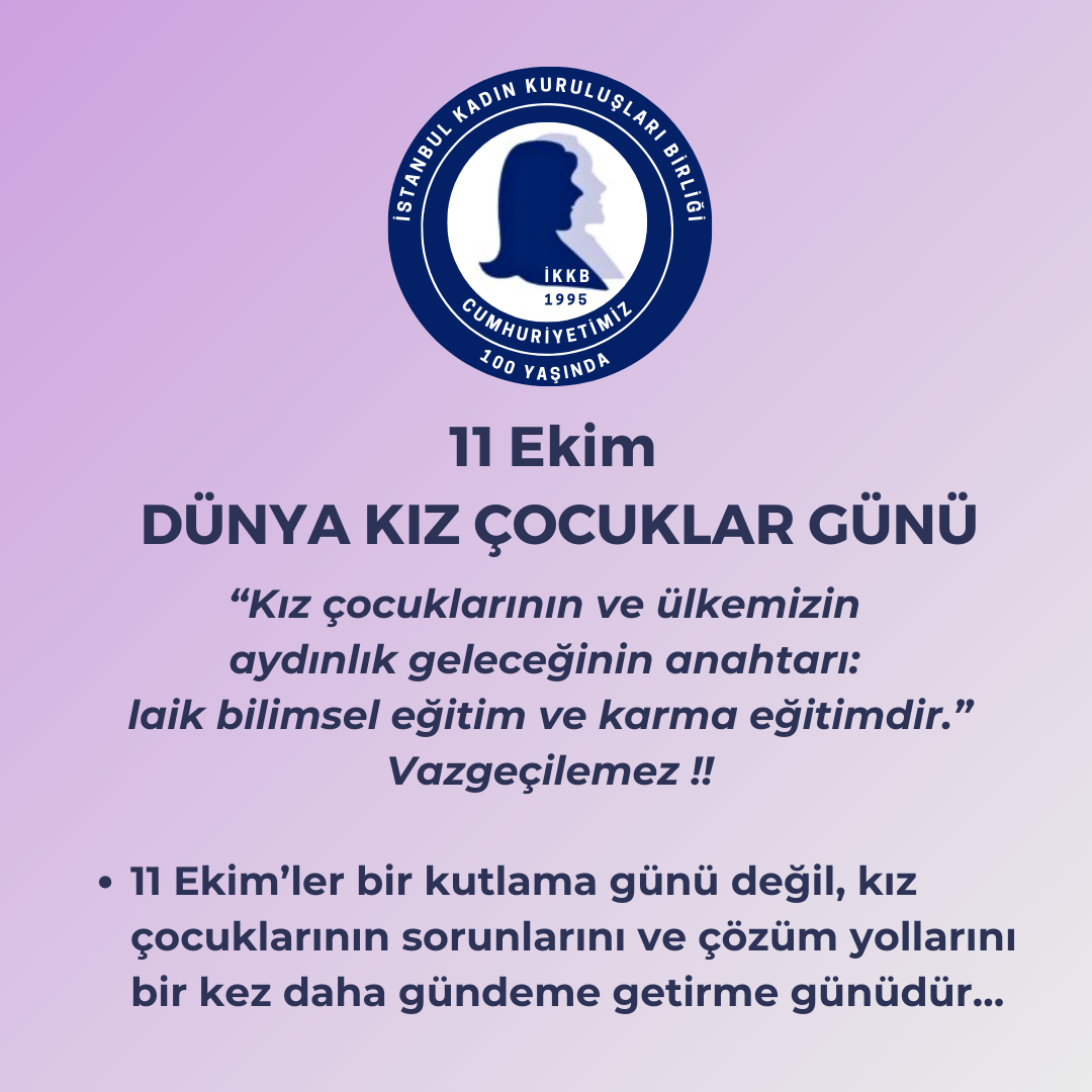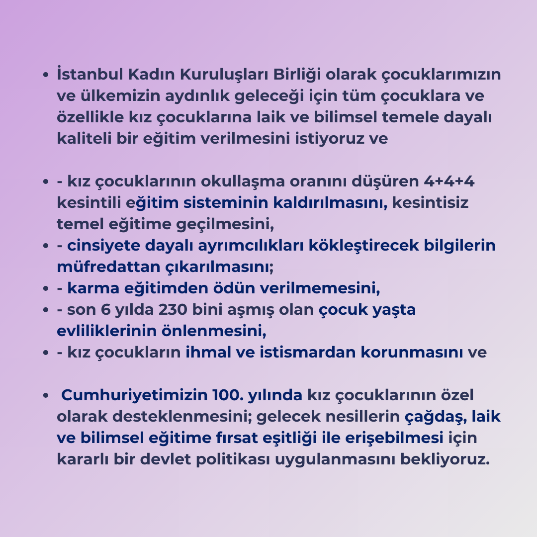 İstanbul Kadın Kuruluşları Birliği olarak çocuklarımızın ve ülkemizin aydınlık geleceği için tüm çocuklara ve özellikle kız çocuklarına laik ve bilimsel temele dayalı kaliteli bir eğitim verilmesini istiyoruz ve