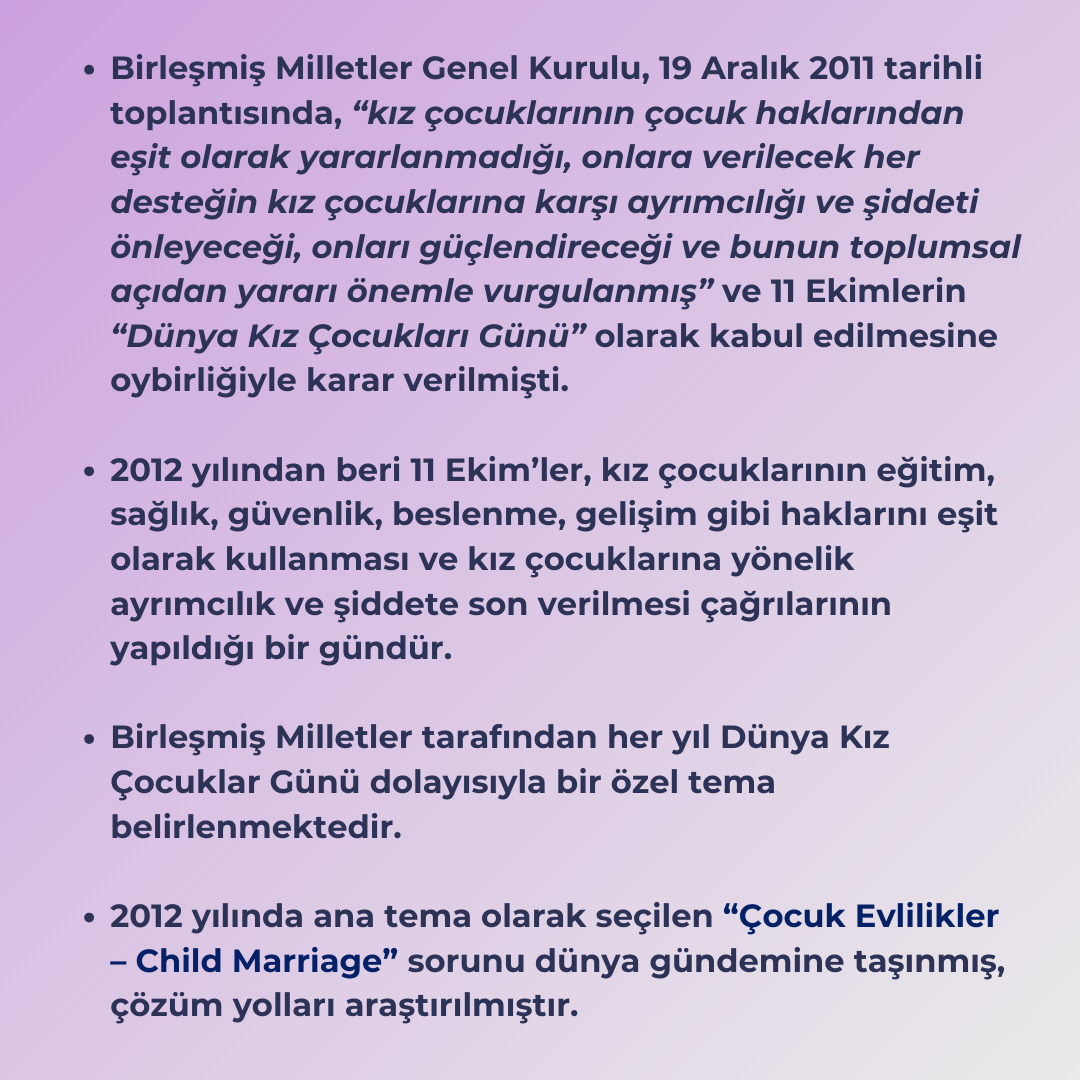 2012 yılından beri 11 Ekim’ler, kız çocuklarının eğitim, sağlık, güvenlik, beslenme, gelişim gibi haklarını eşit olarak kullanması ve kız çocuklarına yönelik ayrımcılık ve şiddete son verilmesi çağrılarının yapıldığı bir gündür.