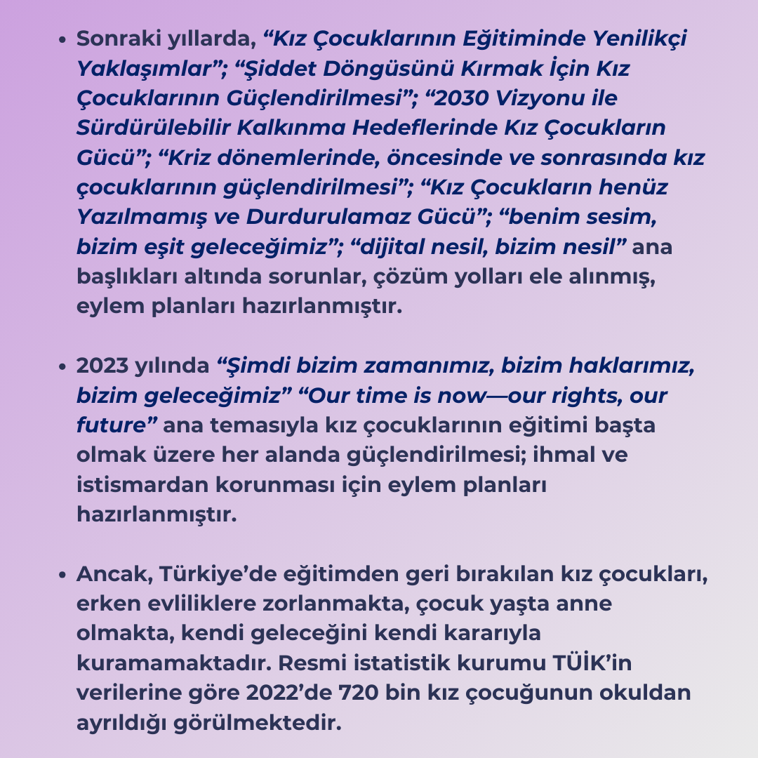 Sonraki yıllarda, “Kız Çocuklarının Eğitiminde Yenilikçi Yaklaşımlar”; “Şiddet Döngüsünü Kırmak İçin Kız Çocuklarının Güçlendirilmesi”; “2030 Vizyonu ile Sürdürülebilir Kalkınma Hedeflerinde Kız Çocukların Gücü”; “Kriz dönemlerinde, öncesinde ve sonrasında kız çocuklarının güçlendirilmesi”; “Kız Çocukların henüz Yazılmamış ve Durdurulamaz Gücü”; “benim sesim, bizim eşit geleceğimiz”; “dijital nesil, bizim nesil” ana başlıkları altında sorunlar, çözüm yolları ele alınmış, eylem planları hazırlanmıştır.