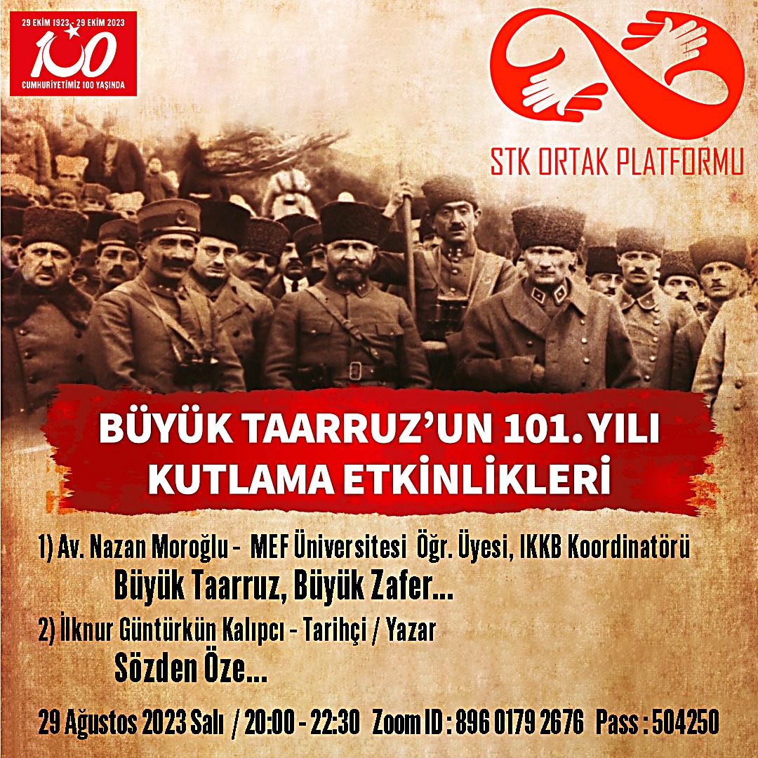 Cumhuriyetimizin 100. Yılı STK Ortak Platformu “Büyük Taarruz ve Zafer Bayramı Kutlamaları” online toplantısında İKKB koordinatörü Nazan Moroğlu ve tarihçi İlknur Güntürkün Kalıpçı 30 Ağustos Zaferinin önemini anlatacaklar.