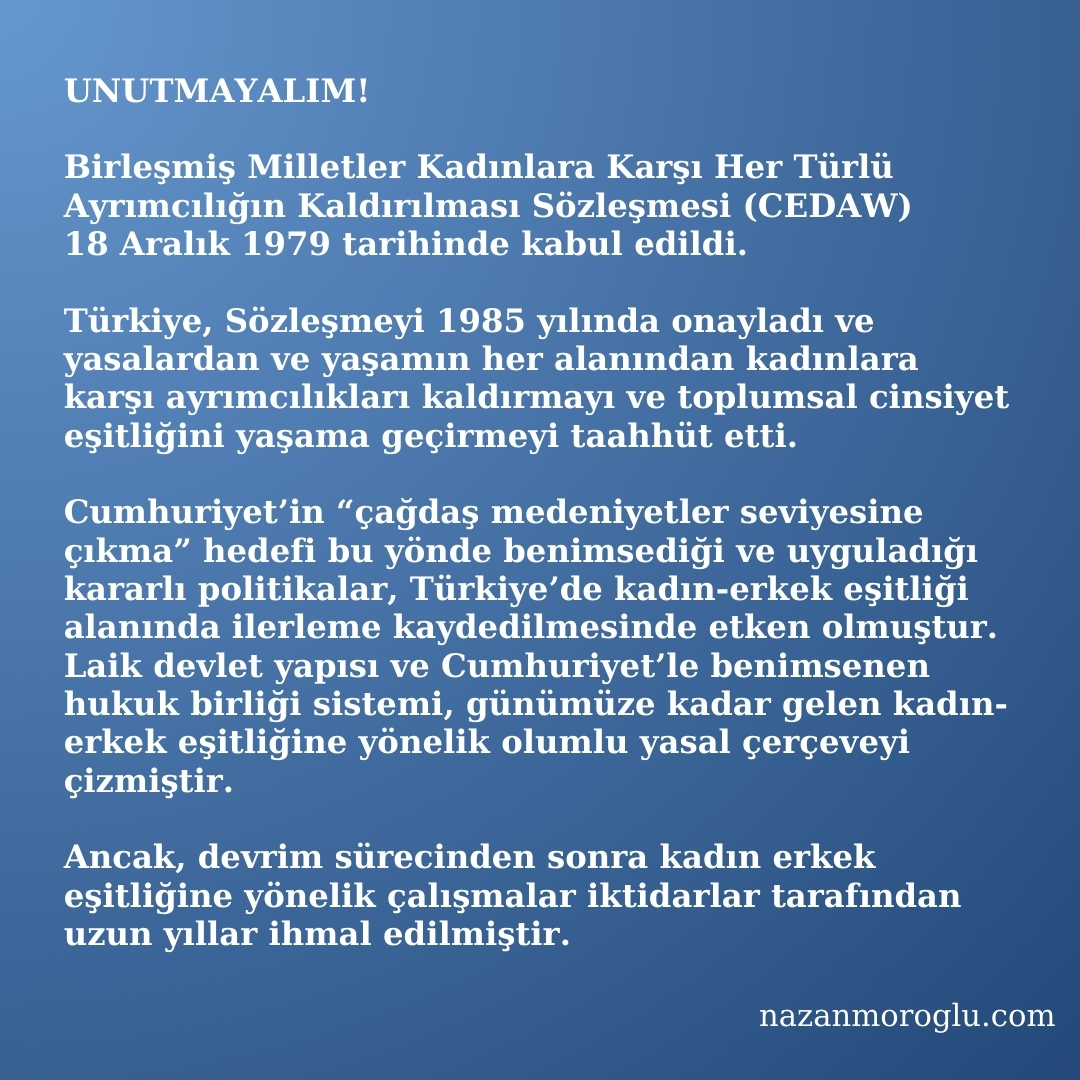 Birleşmiş Milletler Kadınlara Karşı Her Türlü Ayrımcılığın Kaldırılması Sözleşmesi (CEDAW) 18 Aralık 1979 tarihinde kabul edildi. Türkiye, Sözleşmeyi 1985 yılında onayladı ve yasalardan ve yaşamın her alanından kadınlara karşı ayrımcılıkları kaldırmayı ve toplumsal cinsiyet eşitliğini yaşama geçirmeyi taahhüt etti.