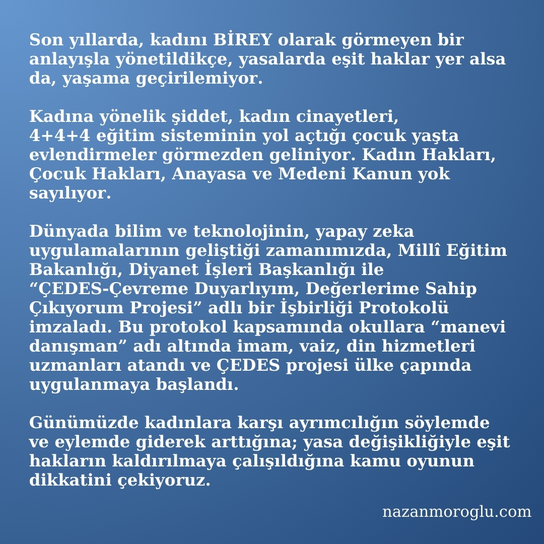 Günümüzde kadınlara karşı ayrımcılığın söylemde ve eylemde giderek arttığına; yasa değişikliğiyle eşit hakların kaldırılmaya çalışıldığına kamuoyunun dikkatini çekiyoruz.