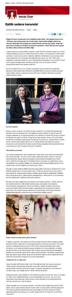 Ana Sayfa Ana sayfa Eşitlik Sadece Kanunda! Ana sayfaBasın Eşitlik Sadece Kanunda! Yazar: Nazan Moroğlu - 31/01/2026 224 https://www.hurriyet.com.tr/yazarlar/verda-ozer/esitlik-sadece-kanunda-43092323 İlgili HaberlerYazarın Diğer İçerikleri Laikliğe İlk Adımın 98. Yıl Dönümü Yaşlı Hakları – Yaşlılık Hukuku Gerçek Eşitlik Ancak Mücadeleyle Kazanılır Medeni Kanun 100 Yaşında Basın Açıklaması Yapay Zeka, Hukuk ve Toplumsal Cinsiyet Eşitliği