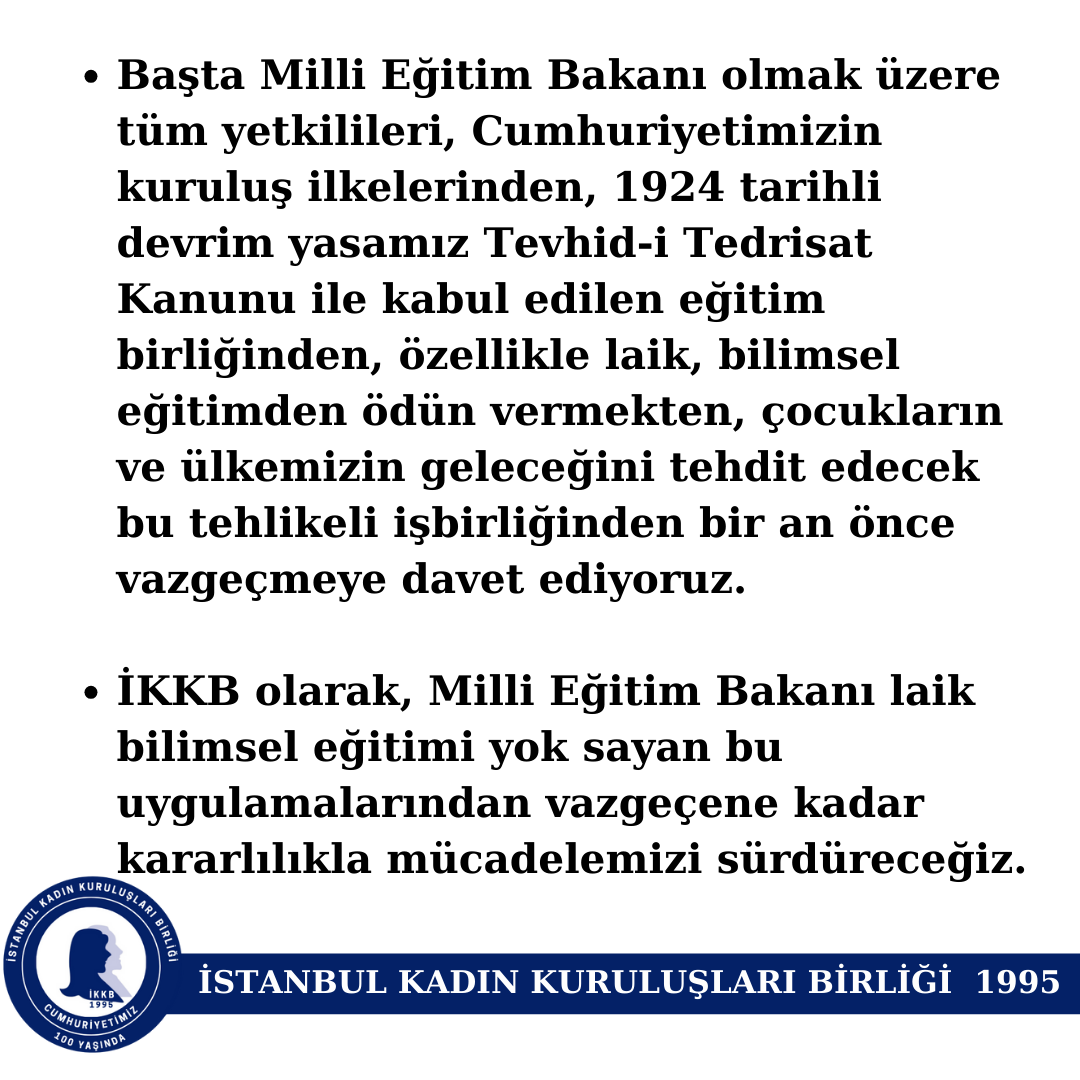 Başta Milli Eğitim Bakanı olmak üzere tüm yetkilileri, Cumhuriyetimizin kuruluş ilkelerinden, 1924 tarihli devrim yasamız Tevhid-i Tedrisat Kanunu ile kabul edilen eğitim birliğinden, özellikle laik, bilimsel eğitimden ödün vermekten, çocukların ve ülkemizin geleceğini tehdit edecek bu tehlikeli işbirliğinden bir an önce vazgeçmeye davet ediyoruz.