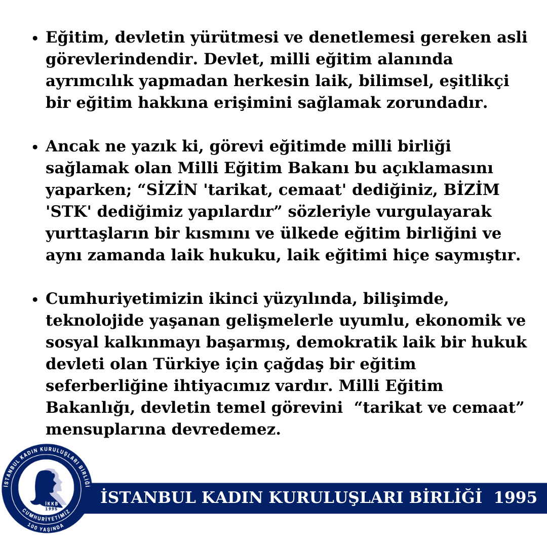 Ancak ne yazık ki, görevi eğitimde milli birliği sağlamak olan Milli Eğitim Bakanı bu açıklamasını yaparken; “SİZİN ‘tarikat, cemaat’ dediğiniz, BİZİM ‘STK’ dediğimiz yapılardır” sözleriyle vurgulayarak yurttaşların bir kısmını ve ülkede eğitim birliğini ve aynı zamanda laik hukuku, laik eğitimi hiçe saymıştır. Cumhuriyetimizin ikinci yüzyılında, bilişimde, teknolojide yaşanan gelişmelerle uyumlu, ekonomik ve sosyal kalkınmayı başarmış, demokratik laik bir hukuk devleti olan Türkiye için çağdaş bir eğitim seferberliğine ihtiyacımız vardır. Milli Eğitim Bakanlığı, devletin temel görevini “tarikat ve cemaat” mensuplarına devredemez.