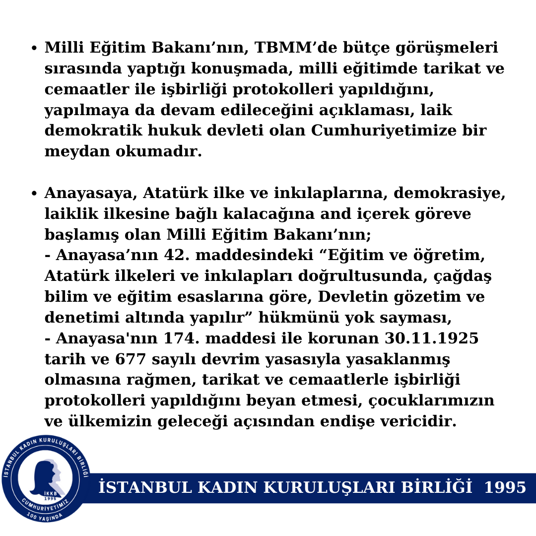 Milli Eğitim Bakanı’nın, TBMM’de bütçe görüşmeleri sırasında yaptığı konuşmada, milli eğitimde tarikat ve cemaatler ile işbirliği protokolleri yapıldığını, yapılmaya da devam edileceğini açıklaması, laik demokratik hukuk devleti olan Cumhuriyetimize bir meydan okumadır.