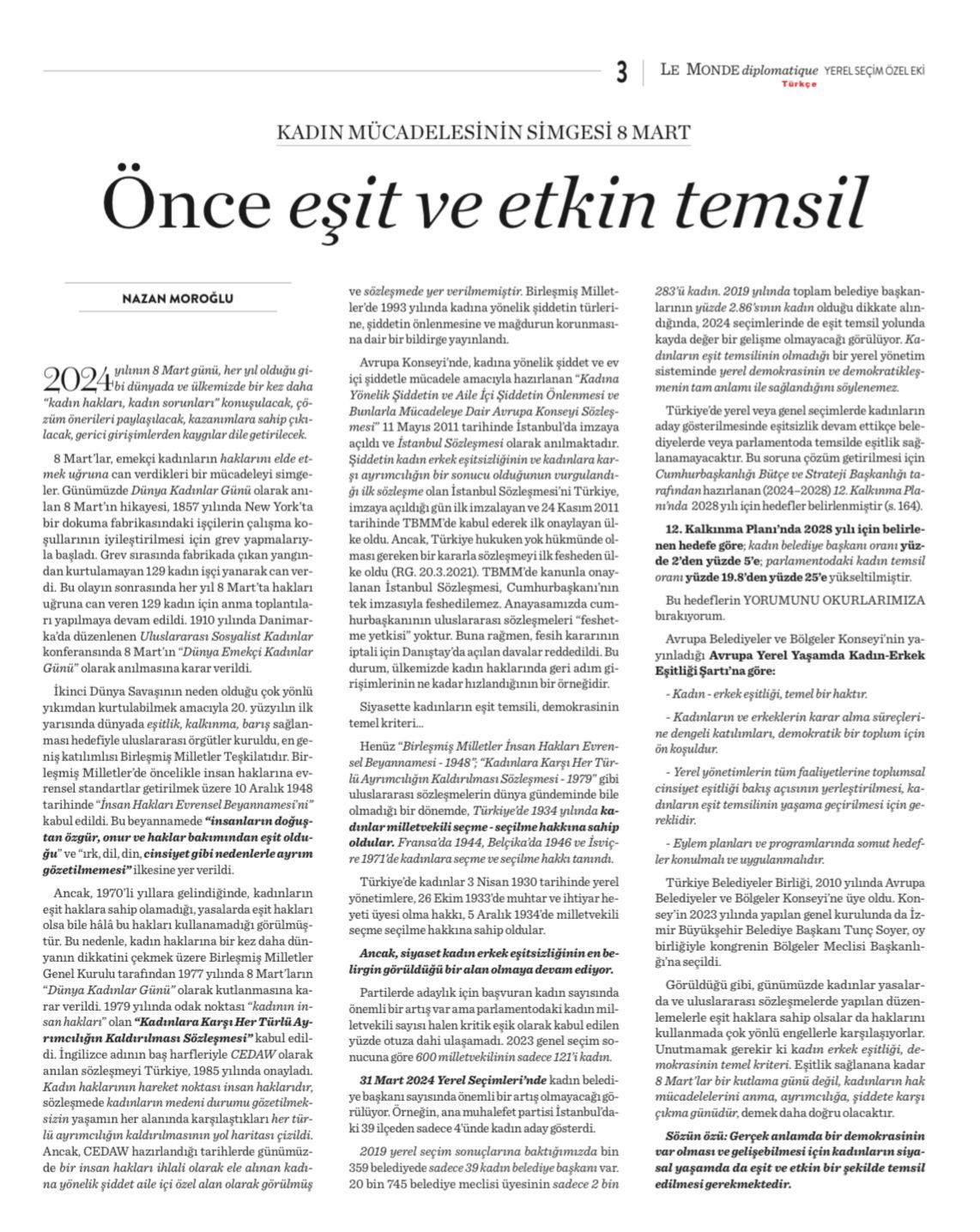 2024 yılının 8 Mart günü, her yıl olduğu gibi dünyada ve ülkemizde bir kez daha “kadın hakları, kadın sorunları” konuşulacak, çözüm önerileri paylaşılacak, kazanımlara sahip çıkılacak, gerici girişimlerden kaygılar dile getirilecek.